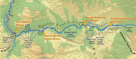 The Upper Colorado River Rafting Map provides valuable information about the river's rapids and their difficulty levels. It categorizes the rapids into classes, ranging from Class I (easy) to Class V (extremely difficult).